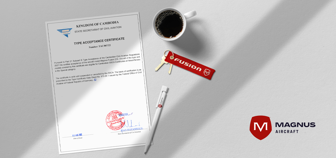 The new type certificate has been issued by the State Secretariat of Civil Aviation of the Kingdom of Cambodia and is considered another milestone for Magnus Aircraft.
